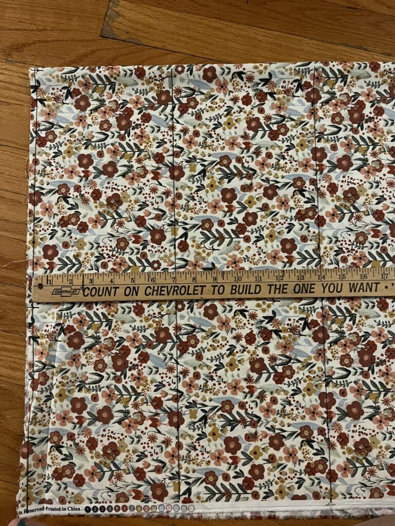 [1] Using the yardstick and permanent marker (or tailors chalk), measure, mark and cut the pieces of accent fabric for your tote.